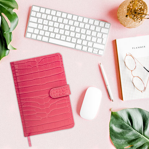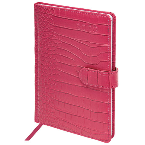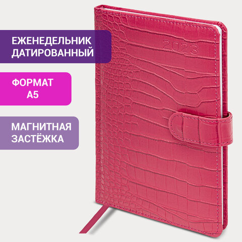 Внутренний блок включает 64 листа белой бумаги плотностью 70 г/м2. Благодаря стандартному формату А5 еженедельник удобно использовать как в офисе, так и на выездных деловых встречах. Твердая обложка, стилизованная под кожу крокодила, фиксируется магнитной застежкой, поэтому еженедельник не откроется в сумке или портфеле и страницы не помнутся. Подходит для горячего тиснения. Дополнением является закладка-ляссе, с помощью которой при необходимости можно быстро открыть еженедельник на нужной странице. Помимо прочего, еженедельник снабжен обширным справочным материалом. Выполнен в красном цвете.