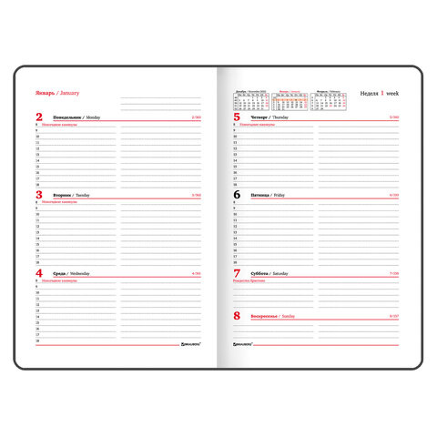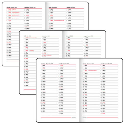 Внутренний блок включает 64 листа белой бумаги плотностью 70 г/м2. Благодаря стандартному формату А5 еженедельник удобно использовать как в офисе, так и на выездных деловых встречах. Жесткая книжная обложка с легкой рельефной фактурой напоминает натуральную кожу классического синего цвета. Материал обложки - балакрон, подходит для тиснения только фольгой. Дополнением является закладка-ляссе, с помощью которой при необходимости можно быстро открыть еженедельник на нужной странице. Помимо прочего, еженедельник снабжен обширным справочным материалом.
