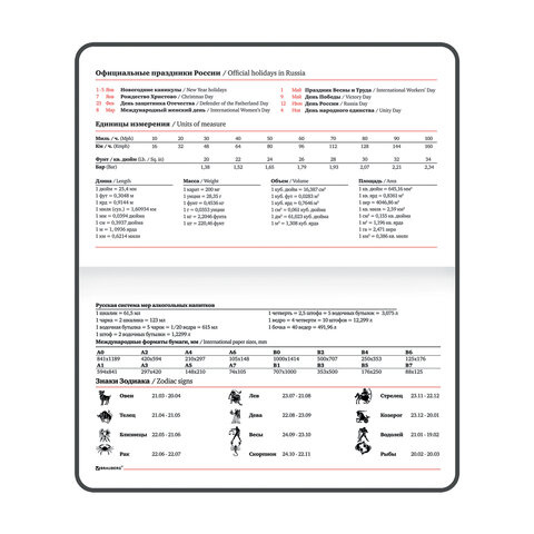 Внутренний блок включает 64 листа белой бумаги плотностью 70 г/м2. Благодаря малому формату А6 еженедельник удобно использовать как в офисе, так и на выездных деловых встречах. Твердая обложка, стилизованная под фактурную кожу коричневого цвета, подходит для горячего тиснения. Дополнением является закладка-ляссе, с помощью которой при необходимости можно быстро открыть еженедельник на нужной странице. Помимо прочего, еженедельник снабжен обширным справочным материалом.