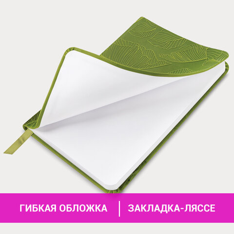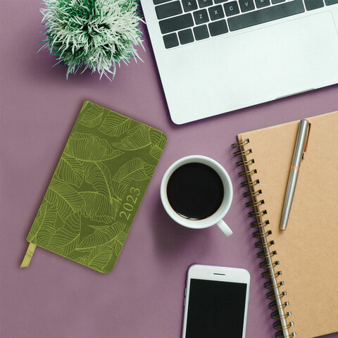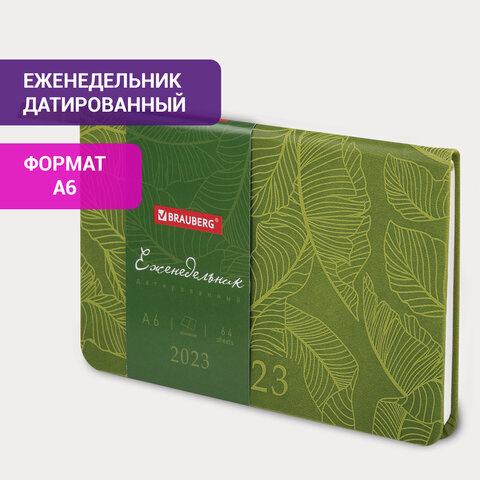 Еженедельник датированный 2023 МАЛЫЙ ФОРМАТ 95х155 мм А6, BRAUBERG 'Foliage', под кожу, зеленый, 113