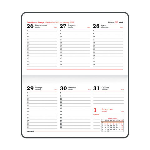 Внутренний блок включает 64 листа белой бумаги плотностью 70 г/м2. Благодаря малому формату А6 еженедельник удобно использовать как в офисе, так и на выездных деловых встречах. Твердая обложка, стилизованная под гладкую кожу, подходит для горячего тиснения. Срез и форзац еженедельника окрашены на контрасте с цветом обложки, что придает ему особый шарм. Дополнением является закладка-ляссе, с помощью которой при необходимости можно быстро открыть еженедельник на нужной странице. Помимо прочего, еженедельник снабжен обширным справочным материалом.