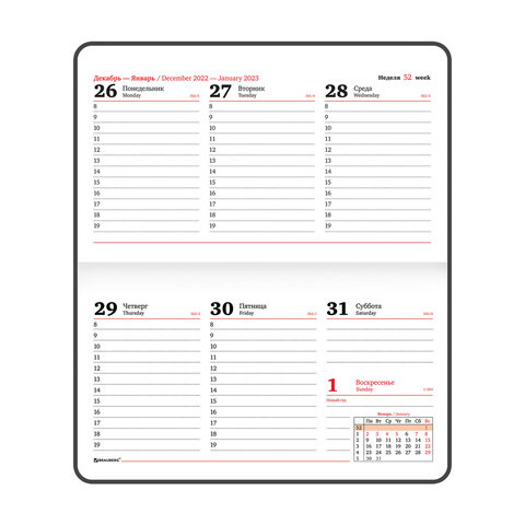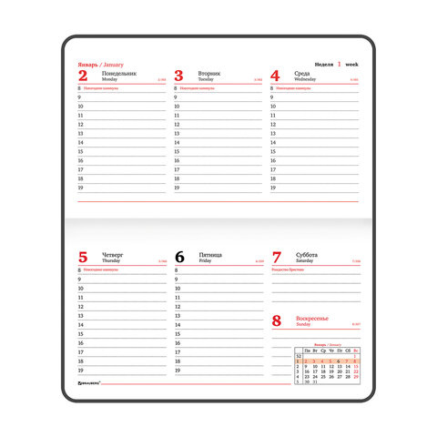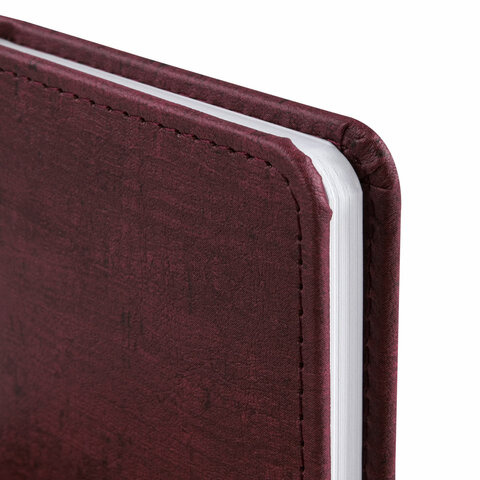 Внутренний блок включает 64 листа белой бумаги плотностью 70 г/м2. Благодаря малому формату А6 еженедельник удобно использовать как в офисе, так и на выездных деловых встречах. Твердая обложка глубокого бордового цвета стилизована под благородное дерево, подходит для горячего тиснения. Дополнением является закладка-ляссе, с помощью которой при необходимости можно быстро открыть еженедельник на нужной странице. Помимо прочего, еженедельник снабжен справочным материалом.