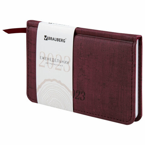 Еженедельник датированный 2023 МАЛЫЙ ФОРМАТ 95х155 мм А6, BRAUBERG 'Wood', под кожу, бордовый, 11397