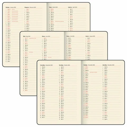 Внутренний блок включает 64 листа кремовой бумаги плотностью 70 г/м2. Благодаря большому формату А4 еженедельник удобно использовать как в офисе, так и на выездных деловых встречах. Твердая обложка, стилизованная под фактурную кожу красного цвета, подходит для горячего тиснения. Дополнением является закладка-ляссе, с помощью которой при необходимости можно быстро открыть еженедельник на нужной странице. Для заметок в еженедельнике имеется 7 страниц в конце внутреннего блока. Еженедельник снабжен обширным справочным материалом.
