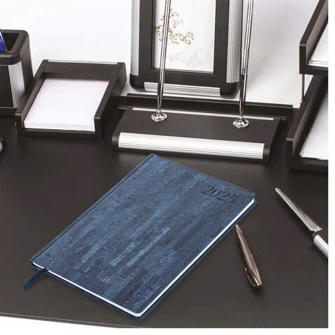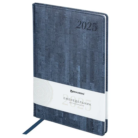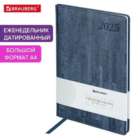 Еженедельник датированный 2025, 210х297 мм, А4, BRAUBERG 'Wood', под кожу, синий, 115945