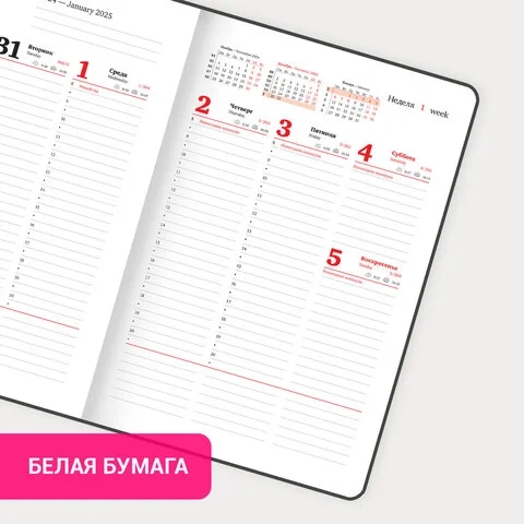 Внутренний блок включает 64 листа белой бумаги плотностью 70 г/м2. Благодаря большому формату А4 еженедельник удобно использовать как в офисе, так и на выездных деловых встречах. Твердая обложка, стилизованная под фактурную кожу благородного синего цвета, подходит для горячего тиснения. Дополнением является закладка-ляссе, с помощью которой при необходимости можно быстро открыть еженедельник на нужной странице. Для заметок в еженедельнике имеется 7 страниц в конце внутреннего блока. Еженедельник снабжен обширным справочным материалом.