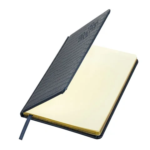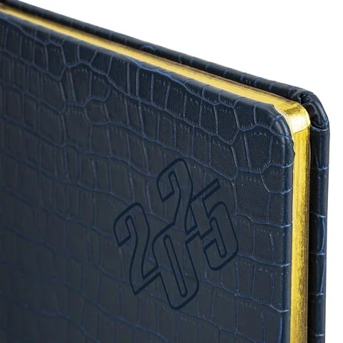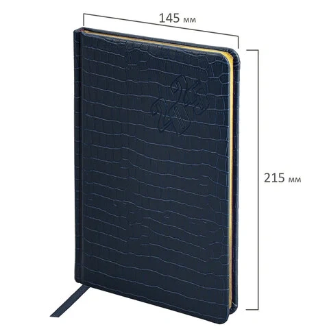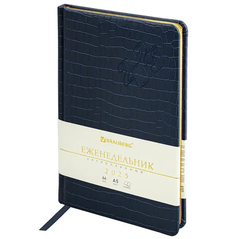 Внутренний блок включает 64 листа тонированной бумаги плотностью 70 г/м2. Благодаря стандартному формату А5 еженедельник удобно использовать как в офисе, так и на выездных деловых встречах. Твердая обложка благородного темно-синего цвета, стилизованная под кожу крокодила, подходит для горячего тиснения. Срез еженедельника фольгирован золотой фольгой, что придает ему особый шарм. Дополнением является закладка-ляссе, с помощью которой при необходимости можно быстро открыть еженедельник на нужной странице. Для заметок в еженедельнике имеется 7 страниц в конце внутреннего блока. Помимо прочего, еженедельник снабжен обширным справочным материалом.