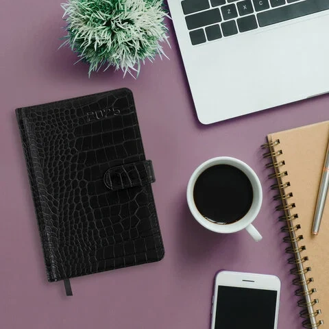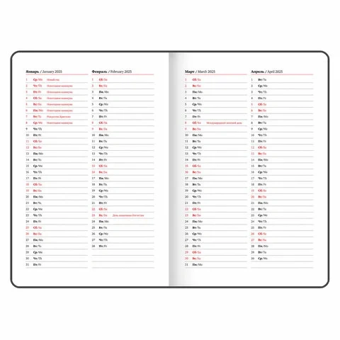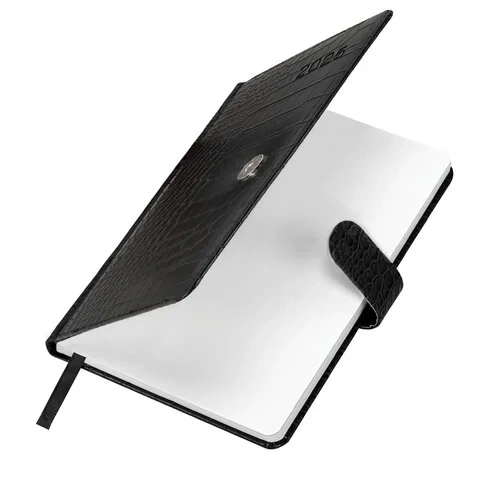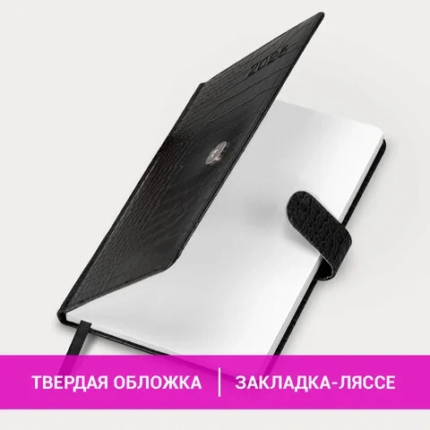 Внутренний блок включает 64 листа белой бумаги плотностью 70 г/м2. Благодаря стандартному формату А5 еженедельник удобно использовать как в офисе, так и на выездных деловых встречах. Твердая обложка, стилизованная под кожу крокодила, фиксируется магнитной застежкой, поэтому еженедельник не откроется в сумке или портфеле и страницы не помнутся. Подходит для горячего тиснения. Дополнением является закладка-ляссе, с помощью которой при необходимости можно быстро открыть еженедельник на нужной странице. Для заметок в еженедельнике имеется 7 страниц в конце внутреннего блока. Еженедельник снабжен обширным справочным материалом. Выполнен в классическом черном цвете.