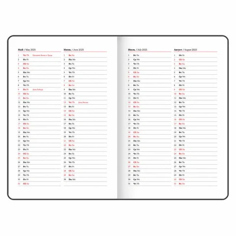 Материал обложки – балакрон, он подходит для тиснения только фольгой. Внутренний блок включает 64 листа белой бумаги плотностью 70 г/м2. Дополнением является закладка-ляссе, с помощью которой при необходимости можно быстро открыть еженедельник на нужной странице. Для заметок в еженедельнике имеется 7 страниц в конце внутреннего блока. Еженедельник снабжен обширным справочным материалом.