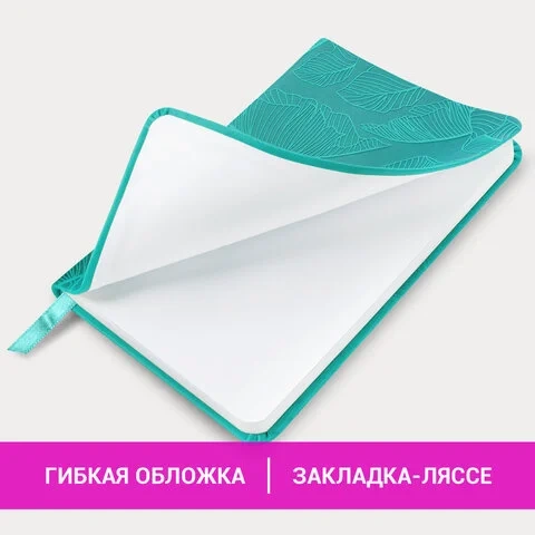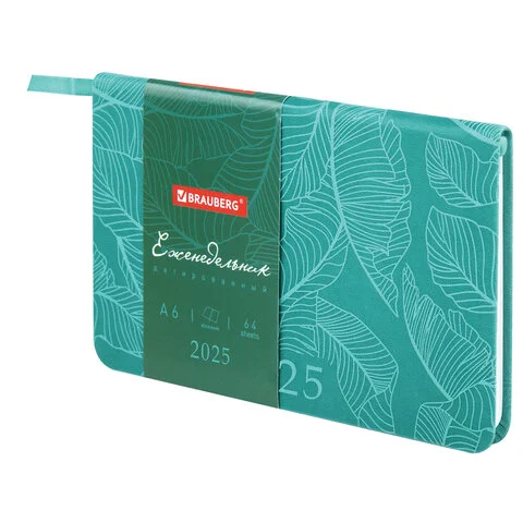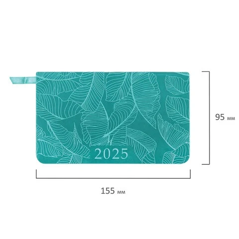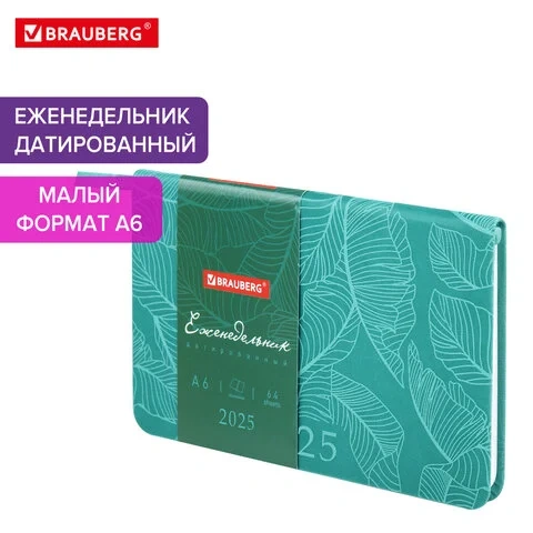 Еженедельник датированный 2025 МАЛЫЙ ФОРМАТ 95х155 мм А6, BRAUBERG 'Foliage', под кожу, бирюза, 1159
