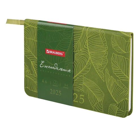 Еженедельник датированный 2025 МАЛЫЙ ФОРМАТ 95х155 мм А6, BRAUBERG 'Foliage', под кожу, зеленый, 115