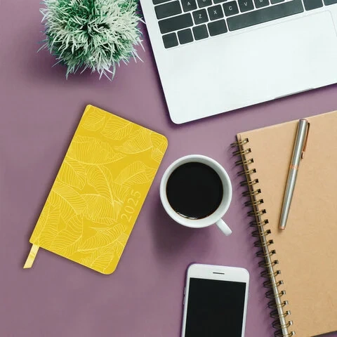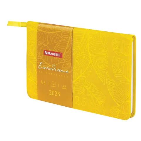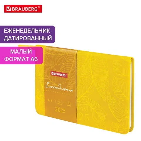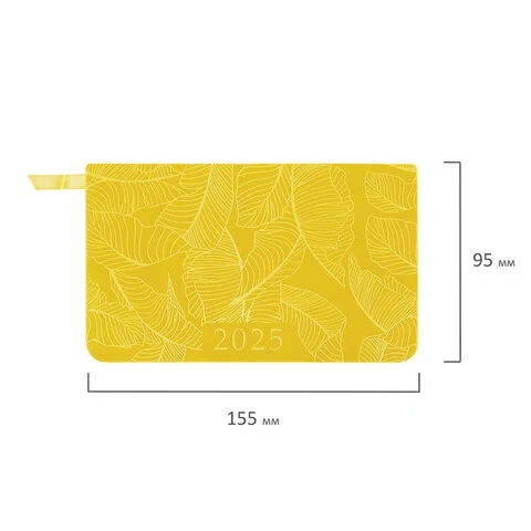 Еженедельник датированный 2025 МАЛЫЙ ФОРМАТ 95х155 мм А6, BRAUBERG 'Foliage', под кожу, желтый, 1159