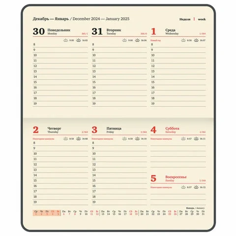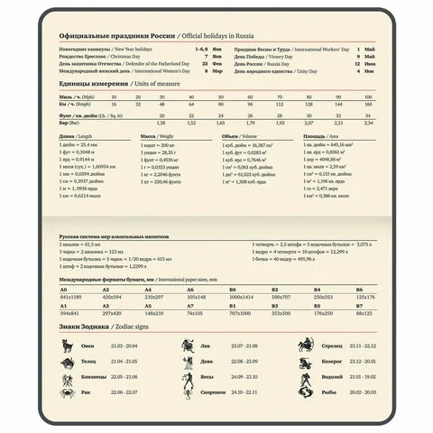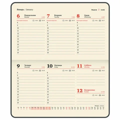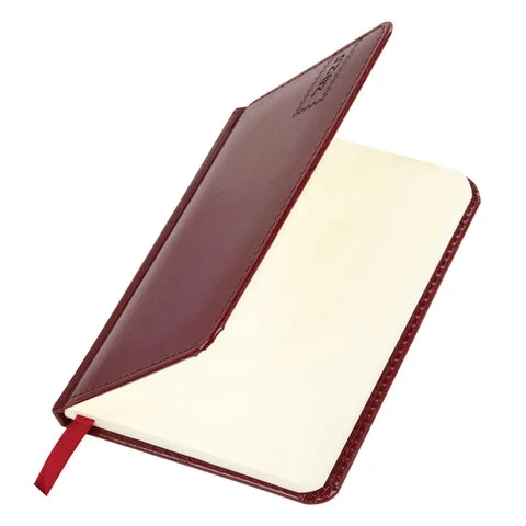 Внутренний блок включает 64 листа тонированной бумаги плотностью 70 г/м2. Благодаря малому формату А6 еженедельник удобно использовать как в офисе, так и на выездных деловых встречах. Твердая обложка, стилизованная под гладкую кожу, подходит для горячего тиснения. Дополнением является закладка-ляссе, с помощью которой при необходимости можно быстро открыть еженедельник на нужной странице. Для заметок в еженедельнике имеется 7 страниц в конце внутреннего блока. Помимо прочего, еженедельник снабжен обширным справочным материалом. Выполнен в благородном бордовом цвете.