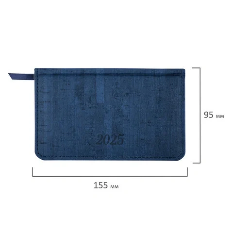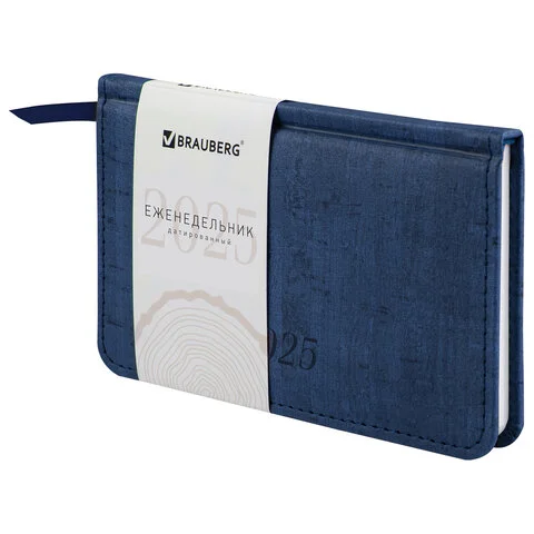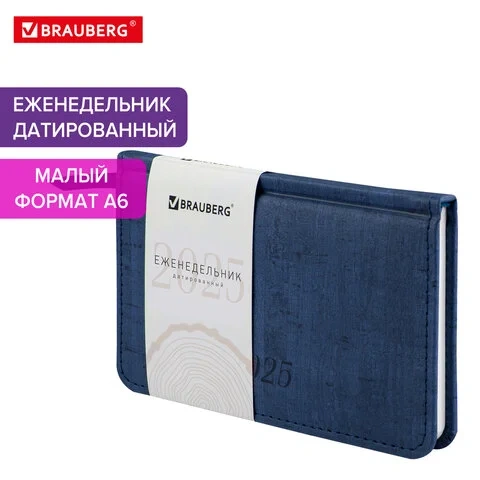 Еженедельник датированный 2025 МАЛЫЙ ФОРМАТ 95х155 мм А6, BRAUBERG 'Wood', под кожу, синий, 115985