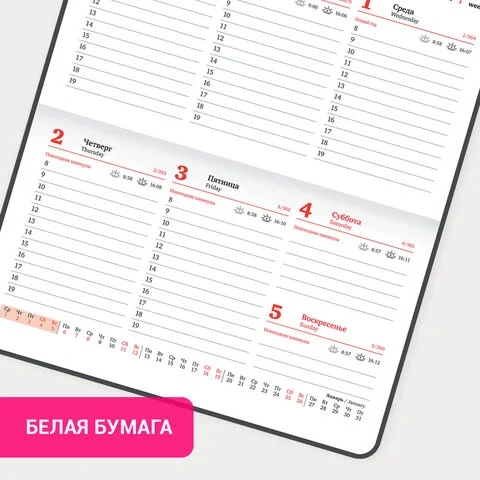 Внутренний блок включает 64 листа белой бумаги плотностью 70 г/м2. Благодаря малому формату А6 еженедельник удобно использовать как в офисе, так и на выездных деловых встречах. Твердая обложка благородного синего цвета, стилизованная под дерево, подходит для горячего тиснения. Дополнением является закладка-ляссе, с помощью которой при необходимости можно быстро открыть еженедельник на нужной странице. Для заметок в еженедельнике имеется 7 страниц в конце внутреннего блока. Помимо прочего, еженедельник снабжен справочным материалом.