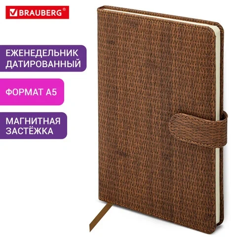 Внутренний блок включает 64 листа тонированной бумаги плотностью 70 г/м2. Благодаря стандартному формату А5 (145х215 мм) еженедельник удобно использовать как в офисе, так и на выездных деловых встречах. Твердая обложка, стилизованная под кожу с текстурной выработкой, фиксируется магнитной застежкой, поэтому еженедельник не откроется в сумке или портфеле и страницы не помнутся. Подходит для горячего тиснения. Еженедельник выполнен в коричневом цвете.