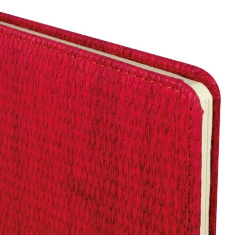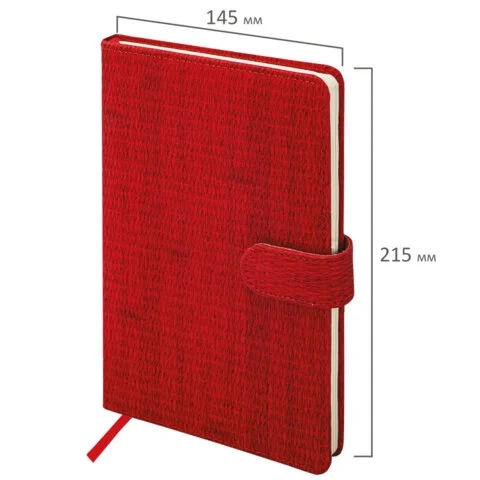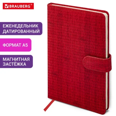 Внутренний блок включает 64 листа тонированной бумаги плотностью 70 г/м2. Благодаря стандартному формату А5 (145х215 мм) еженедельник удобно использовать как в офисе, так и на выездных деловых встречах. Твердая обложка, стилизованная под кожу с текстурной выработкой, фиксируется магнитной застежкой, поэтому еженедельник не откроется в сумке или портфеле и страницы не помнутся. Подходит для горячего тиснения. Еженедельник выполнен в красном цвете.