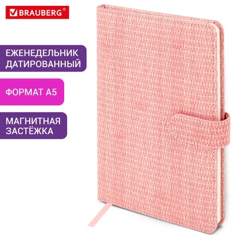 Еженедельник датированный 2026 А5 145х215 мм, BRAUBERG 'Augustus', под кожу, розовый, 117163