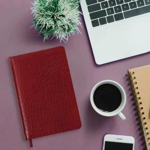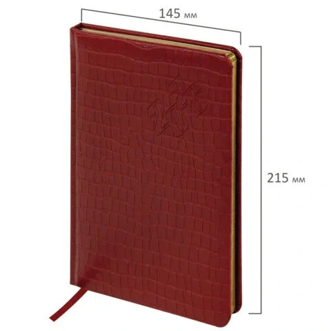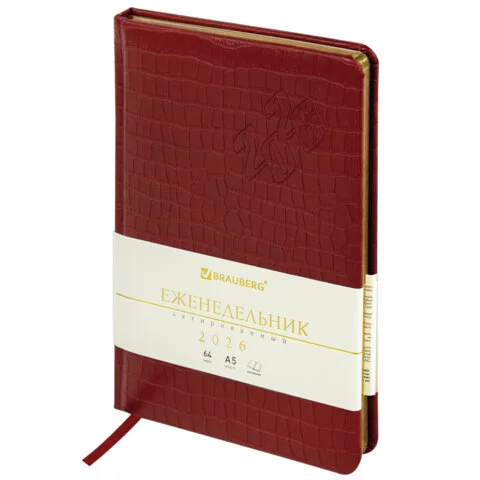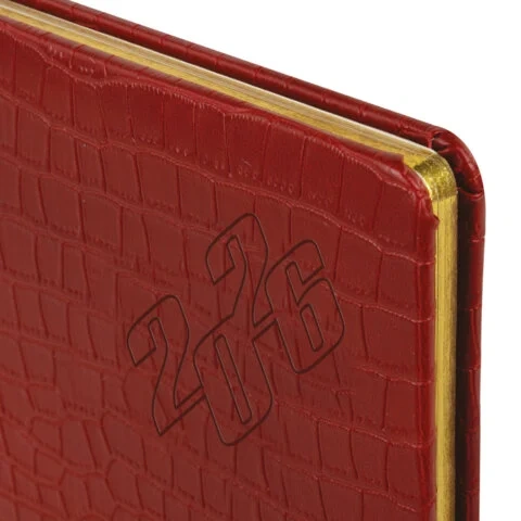 Внутренний блок включает 64 листа тонированной бумаги плотностью 70 г/м2. Благодаря стандартному формату А5 (145х215 мм) еженедельник удобно использовать как в офисе, так и на выездных деловых встречах. Твердая обложка красного цвета, стилизованная под кожу крокодила, подходит для горячего тиснения. Срез еженедельника покрыт золотой фольгой, что придает ему особый шарм.