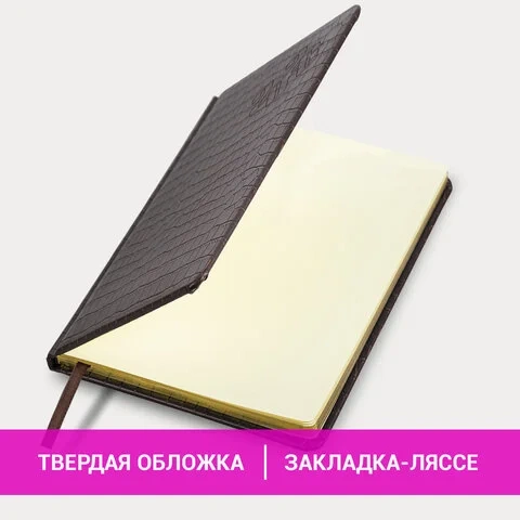 Внутренний блок включает 64 листа тонированной бумаги плотностью 70 г/м2. Благодаря стандартному формату А5 (145х215 мм) еженедельник удобно использовать как в офисе, так и на выездных деловых встречах. Твердая обложка темно-коричневого цвета, стилизованная под кожу крокодила, подходит для горячего тиснения. Срез еженедельника покрыт золотой фольгой, что придает ему особый шарм.