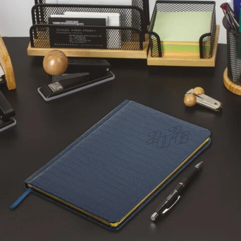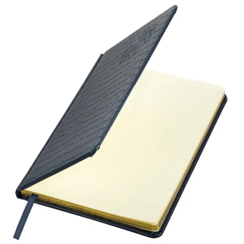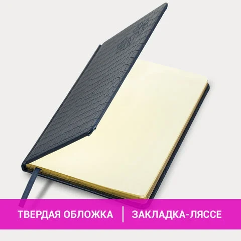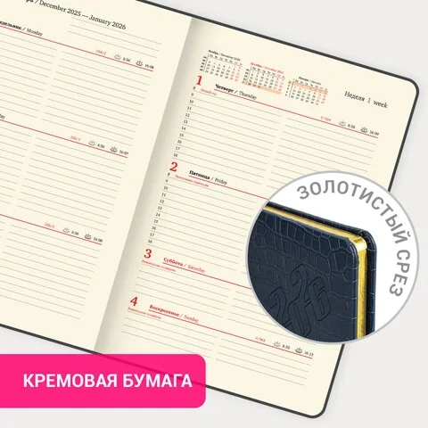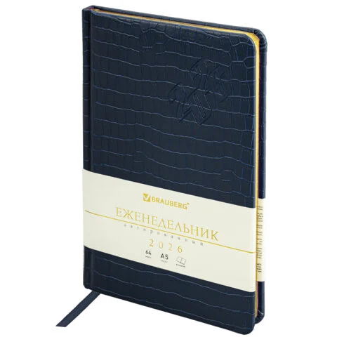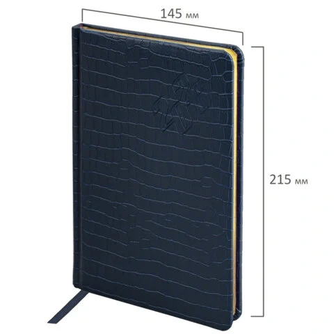 Внутренний блок включает 64 листа тонированной бумаги плотностью 70 г/м2. Благодаря стандартному формату А5 (145х215 мм) еженедельник удобно использовать как в офисе, так и на выездных деловых встречах. Твердая обложка благородного темно-синего цвета, стилизованная под кожу крокодила, подходит для горячего тиснения. Срез еженедельника фольгирован покрыт фольгой, что придает ему особый шарм.