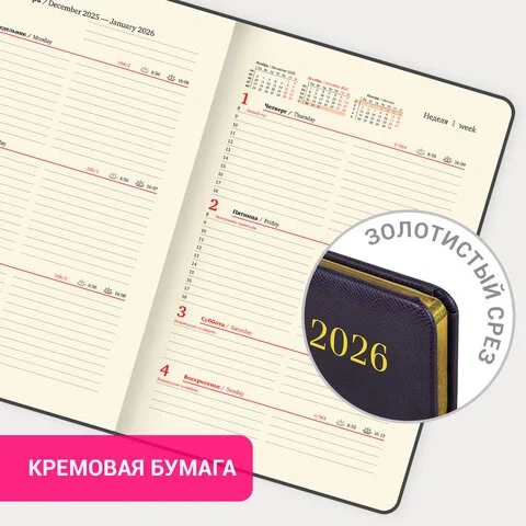 Срез еженедельника украшен золотым фольгированием – это подчеркивает премиальность изделия. Дополнением является закладка-ляссе, с помощью которой при необходимости можно быстро открыть еженедельник на нужной странице. В конце внутреннего блока есть 7 страниц для записей и заметок. Обширный справочный материал расширяет функциональность еженедельника.