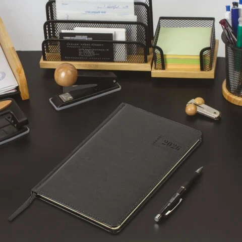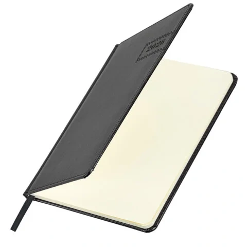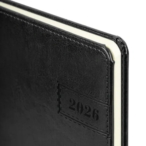 Внутренний блок включает 64 листа тонированной бумаги плотностью 70 г/м2. Благодаря стандартному формату А5 еженедельник удобно использовать как в офисе, так и на выездных деловых встречах. Твердая обложка, стилизованная под гладкую кожу, выполнена в классическом черном цвете и подходит для горячего тиснения.