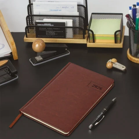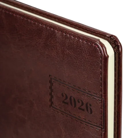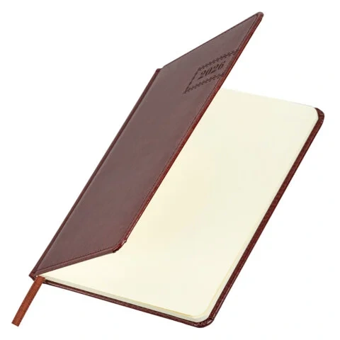 Внутренний блок включает 64 листа тонированной бумаги плотностью 70 г/м2. Благодаря стандартному формату А5 еженедельник удобно использовать как в офисе, так и на выездных деловых встречах. Твердая обложка, стилизованная под гладкую кожу, выполнена в благородном коричневом цвете и подходит для горячего тиснения.