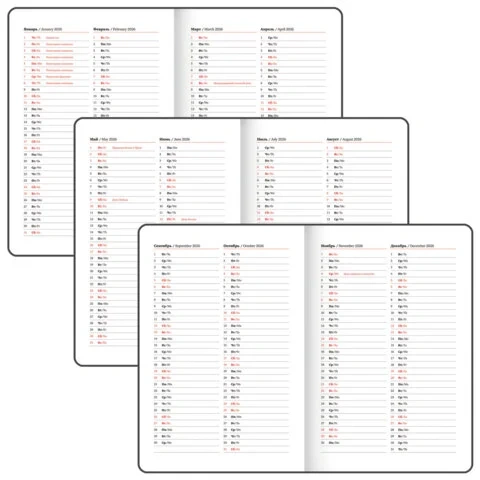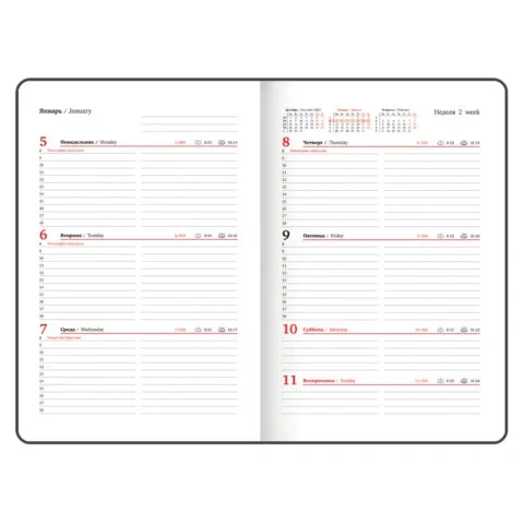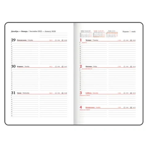 Дополнением является закладка-ляссе, с помощью которой при необходимости можно быстро открыть еженедельник на нужной странице. Для заметок в еженедельнике есть 7 страниц в конце внутреннего блока. Еженедельник снабжен обширным справочным материалом.