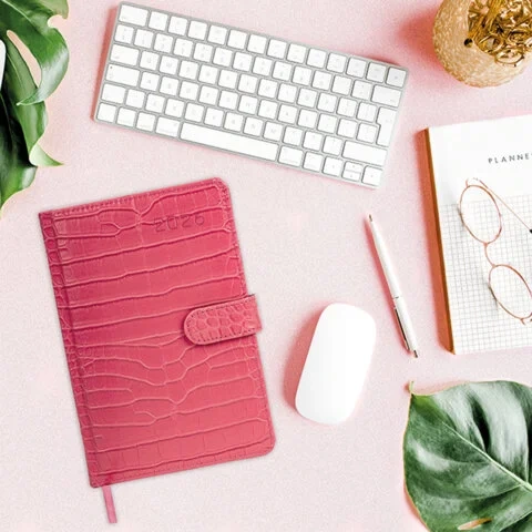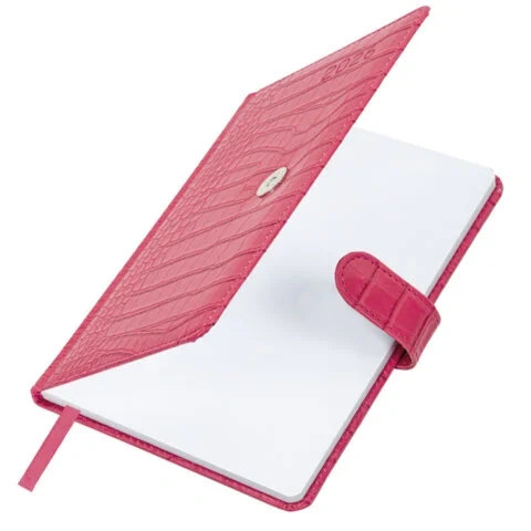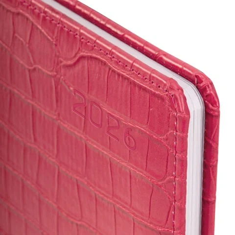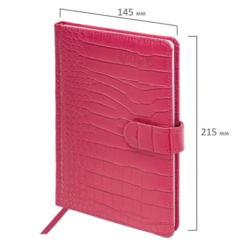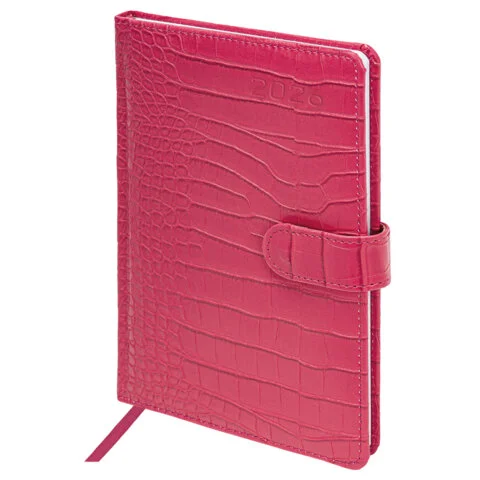 Внутренний блок включает 64 листа белой бумаги плотностью 70 г/м2. Благодаря стандартному формату А5 (145х215 мм) еженедельник удобно использовать как в офисе, так и на выездных деловых встречах. Твердая обложка розового цвета, стилизованная под кожу крокодила, фиксируется магнитной застежкой, поэтому еженедельник не откроется в сумке или портфеле и страницы не помнутся. Подходит для горячего тиснения.