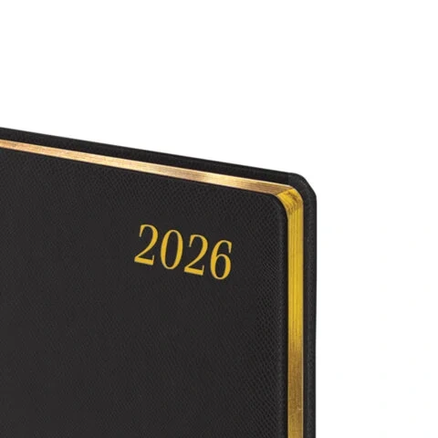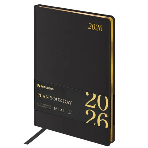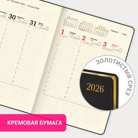 Внутренний блок включает 64 листа кремовой бумаги плотностью 70 г/м2. Благодаря большому формату А4 еженедельник удобно использовать как в офисе, так и на выездных деловых встречах. Твердая обложка, стилизованная под фактурную кожу черного цвета, подходит для горячего тиснения.