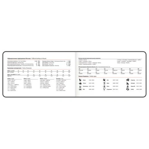 Дополнением является закладка-ляссе, с помощью которой при необходимости можно быстро открыть еженедельник на нужной странице. Для заметок в еженедельнике есть 7 страниц в конце внутреннего блока. Помимо прочего, еженедельник снабжен обширным справочным материалом.