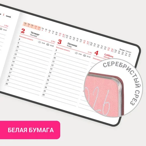 Внутренний блок включает 64 листа белой бумаги плотностью 70 г/м2. Благодаря малому формату А6 (105х160 мм) еженедельник удобно использовать как в офисе, так и на выездных деловых встречах. Гибкая обложка розового цвета, стилизованная под фактурную кожу с блеском, подходит для горячего тиснения.
