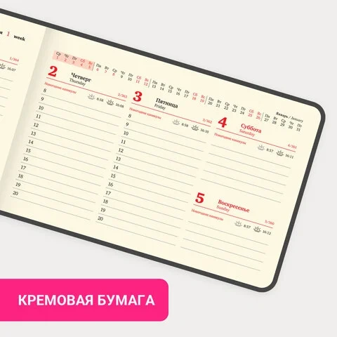 Дополнением является закладка-ляссе, с помощью которой при необходимости можно быстро открыть еженедельник на нужной странице. Для заметок в еженедельнике есть 7 страниц в конце внутреннего блока. Помимо прочего, еженедельник снабжен обширным справочным материалом.