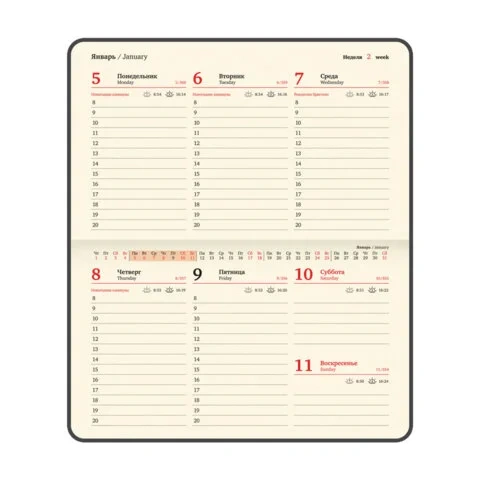 Дополнением является закладка-ляссе, с помощью которой при необходимости можно быстро открыть еженедельник на нужной странице. Для заметок в еженедельнике есть 7 страниц в конце внутреннего блока. Помимо прочего, еженедельник снабжен обширным справочным материалом.