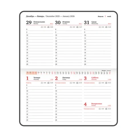 Дополнением является закладка-ляссе, с помощью которой при необходимости можно быстро открыть еженедельник на нужной странице. Для заметок в еженедельнике есть 7 страниц в конце внутреннего блока. Помимо прочего, еженедельник снабжен обширным справочным материалом.