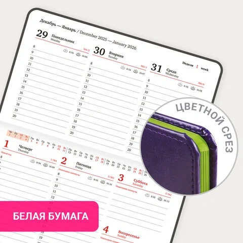 Срез и форзац еженедельника окрашены на контрасте с цветом обложки, что придает ему особый шарм. Дополнением является закладка-ляссе, с помощью которой при необходимости можно быстро открыть еженедельник на нужной странице. В конце внутреннего блока есть 7 страниц для записей и заметок. Обширный справочный материал расширяет функциональность еженедельника.