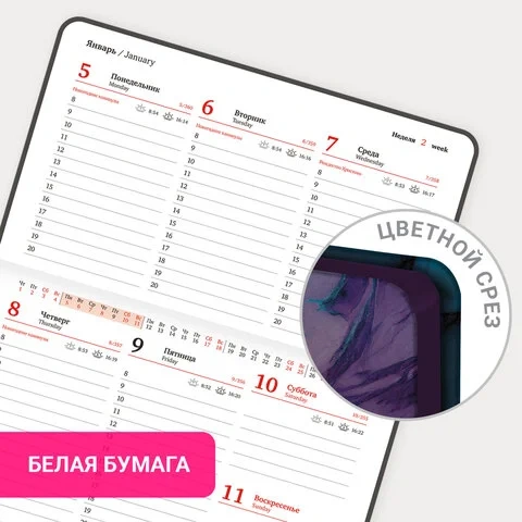 Дополнением является закладка-ляссе, с помощью которой при необходимости можно быстро открыть еженедельник на нужной странице. Для заметок в еженедельнике есть 7 страниц в конце внутреннего блока. Помимо прочего, еженедельник снабжен обширным справочным материалом.