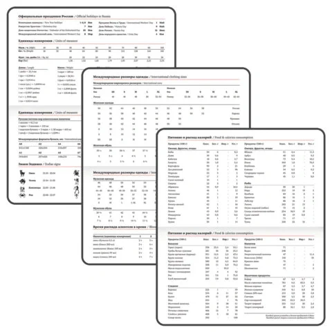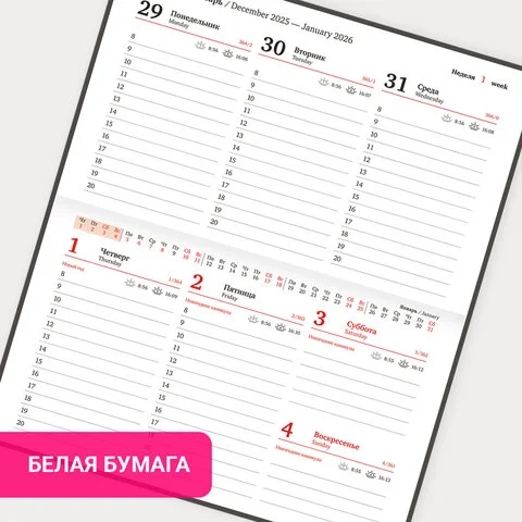 Дополнением является закладка-ляссе, с помощью которой при необходимости можно быстро открыть еженедельник на нужной странице. Для заметок в еженедельнике есть 7 страниц в конце внутреннего блока. Помимо прочего, еженедельник снабжен справочным материалом.