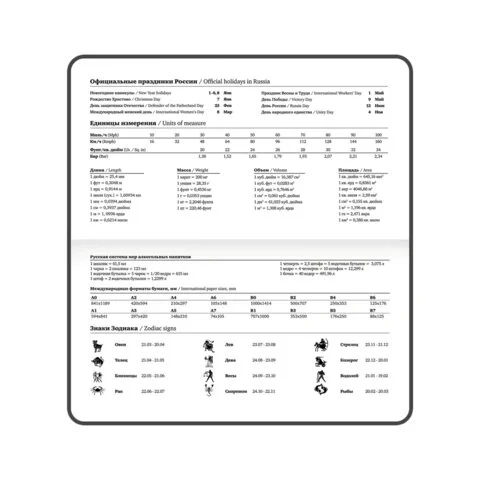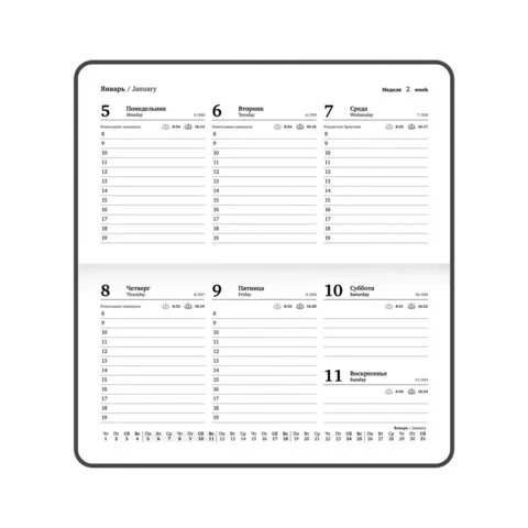 Внутренний блок содержит 64 листа офсетной бумаги белого цвета плотностью 60 г/м2. Благодаря малому формату (171х93 мм) еженедельник удобно использовать как в офисе, так и на выездных деловых встречах.