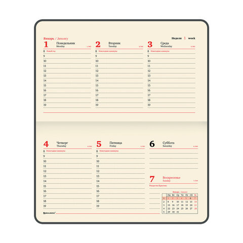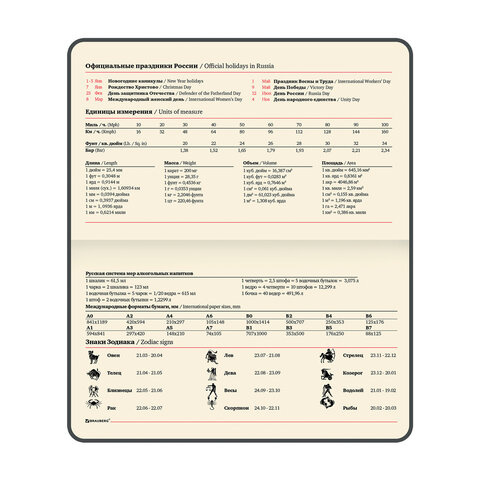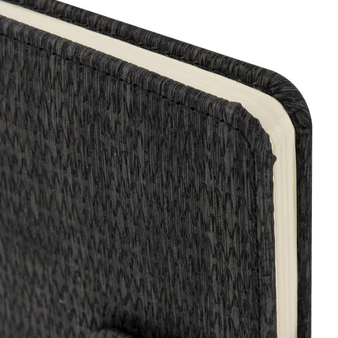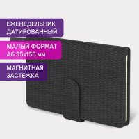 Внутренний блок включает 64 листа тонированной бумаги плотностью 70 г/м2. Благодаря малому формату А6 еженедельник удобно использовать как в офисе, так и на выездных деловых встречах. Черная твердая обложка, стилизованная под кожу с текстурной выработкой, фиксируется магнитной застежкой, поэтому еженедельник не откроется в сумке или портфеле и страницы не помнутся. Подходит для горячего тиснения. Дополнением является закладка-ляссе, с помощью которой при необходимости можно быстро открыть еженедельник на нужной странице. Помимо прочего, еженедельник снабжен обширным справочным материалом.