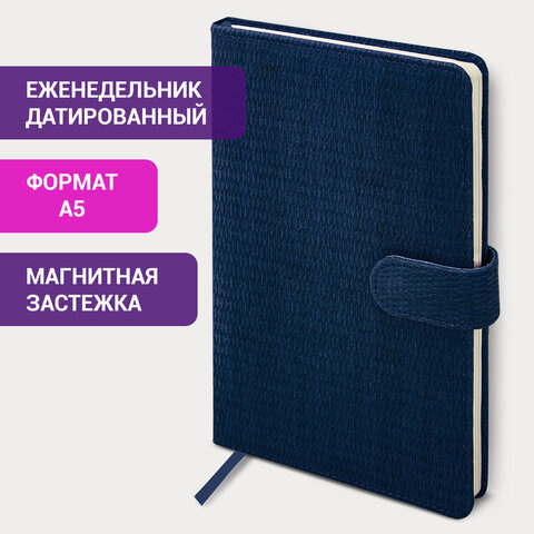 Внутренний блок включает 64 листа тонированной бумаги плотностью 70 г/м2. Благодаря стандартному формату А5 еженедельник удобно использовать как в офисе, так и на выездных деловых встречах. Твердая обложка, стилизованная под кожу с текстурной выработкой, фиксируется магнитной застежкой, поэтому еженедельник не откроется в сумке или портфеле и страницы не помнутся. Подходит для горячего тиснения. Дополнением является закладка-ляссе, с помощью которой при необходимости можно быстро открыть еженедельник на нужной странице. Помимо прочего, еженедельник снабжен обширным справочным материалом. Выполнен в классическом темно-синем цвете.