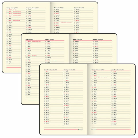 Внутренний блок включает 64 листа тонированной бумаги плотностью 70 г/м2. Благодаря стандартному формату А5 еженедельник удобно использовать как в офисе, так и на выездных деловых встречах. Твердая обложка, стилизованная под кожу крокодила красного цвета, подходит для горячего тиснения. Срез еженедельника фольгирован золотой фольгой, что придает ему особый шарм. Дополнением является закладка-ляссе, с помощью которой при необходимости можно быстро открыть еженедельник на нужной странице. Помимо прочего, еженедельник снабжен обширным справочным материалом.