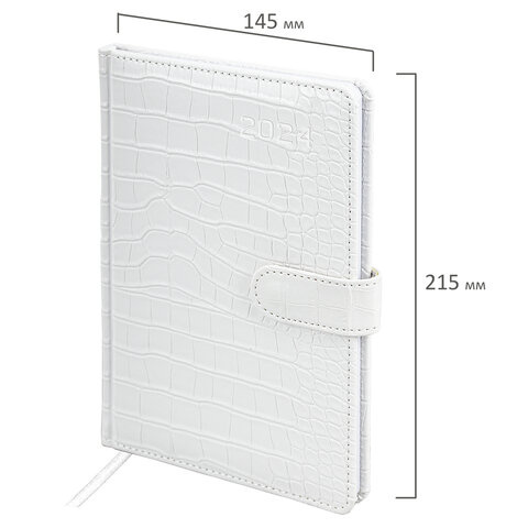 Внутренний блок включает 64 листа белой бумаги плотностью 70 г/м2. Благодаря стандартному формату А5 еженедельник удобно использовать как в офисе, так и на выездных деловых встречах. Твердая обложка, стилизованная под кожу крокодила, фиксируется магнитной застежкой, поэтому еженедельник не откроется в сумке или портфеле и страницы не помнутся. Подходит для горячего тиснения. Дополнением является закладка-ляссе, с помощью которой при необходимости можно быстро открыть еженедельник на нужной странице. Помимо прочего, еженедельник снабжен обширным справочным материалом. Выполнен в классическом белом цвете.