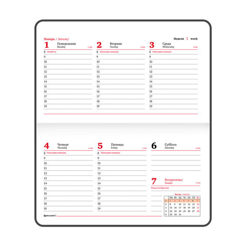 Внутренний блок включает 64 листа белой бумаги плотностью 70 г/м2. Благодаря малому формату А6 (95х155 мм) датированный еженедельник удобно использовать как в офисе, так и на выездных деловых встречах. Твердая обложка стилизована под гладкую кожу яркого сиреневого цвета. Подходит для горячего тиснения. Срез и форзац еженедельника окрашены на контрасте с цветом обложки, что придает ему особый шарм. Дополнением является закладка-ляссе, с помощью которой при необходимости можно быстро открыть еженедельник на нужной странице. Помимо прочего, еженедельник снабжен обширным справочным материалом.
