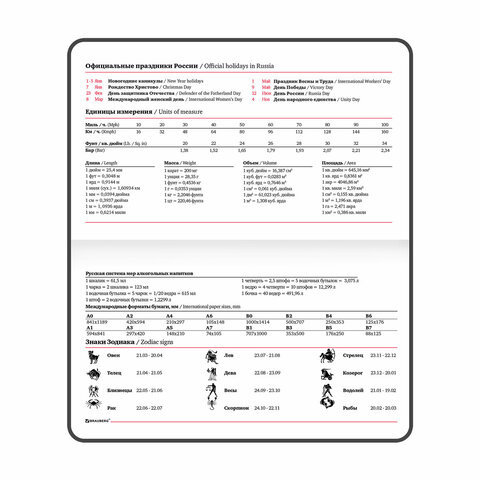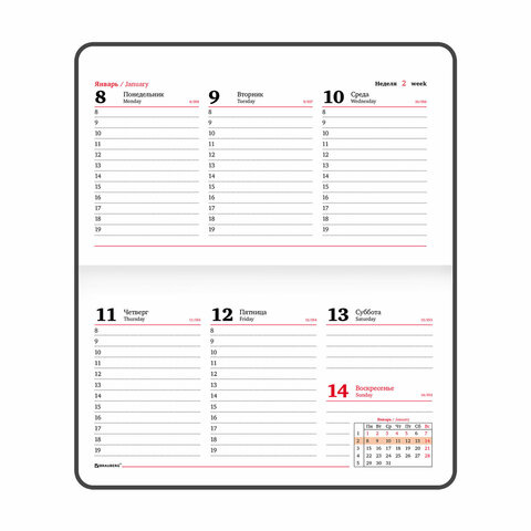 Внутренний блок включает 64 листа белой бумаги плотностью 70 г/м2. Благодаря малому формату А6 еженедельник удобно использовать как в офисе, так и на выездных деловых встречах. Твердая обложка стилизована под гладкую кожу. Материал обложки подходит для горячего тиснения. Дополнением является закладка-ляссе, с помощью которой при необходимости можно быстро открыть еженедельник на нужной странице. Помимо прочего, еженедельник снабжен обширным справочным материалом.