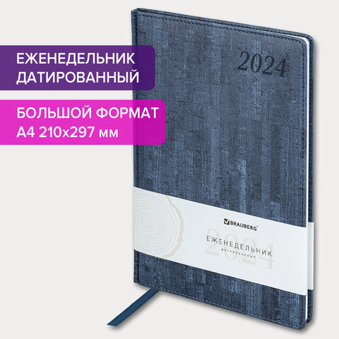 Еженедельник датированный Brauberg Wood синий, А4, 64 листа, под кожу, 2024