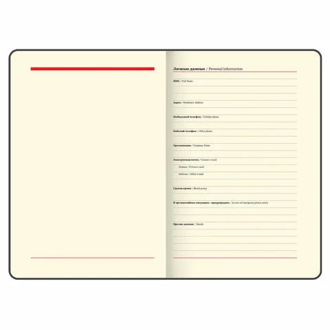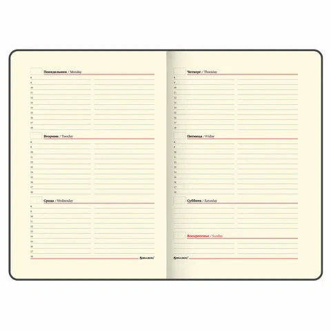 Внутренний блок содержит 64 листа тонированной бумаги плотностью 70 г/м2. Твердая обложка стилизована под фактурную кожу. Подходит для горячего тиснения. Дополнением является закладка-ляссе, с помощью которой при необходимости можно быстро открыть еженедельник на нужной странице.