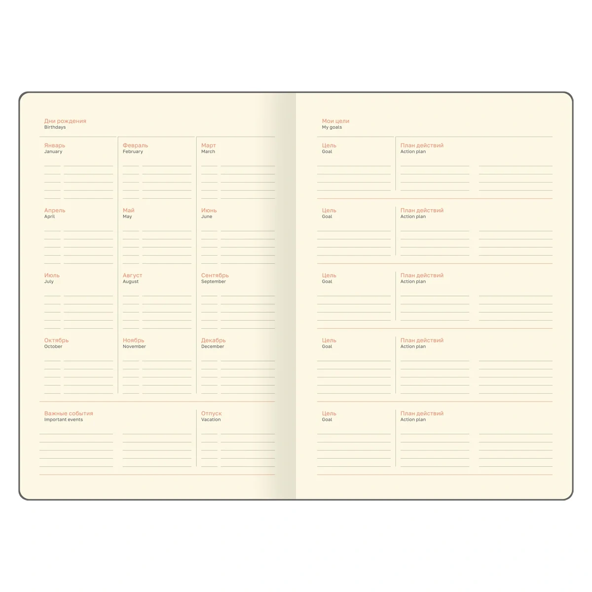 Содержит календарь на 4 года, место для записи дней рождения и постановки целей, а также помесячное планирование на год, листы для заметок и зарисовок. В комплекте с ежедневником идёт лист с наклейками для составления планов. Индивидуальная упаковка гарантирует его сохранность.