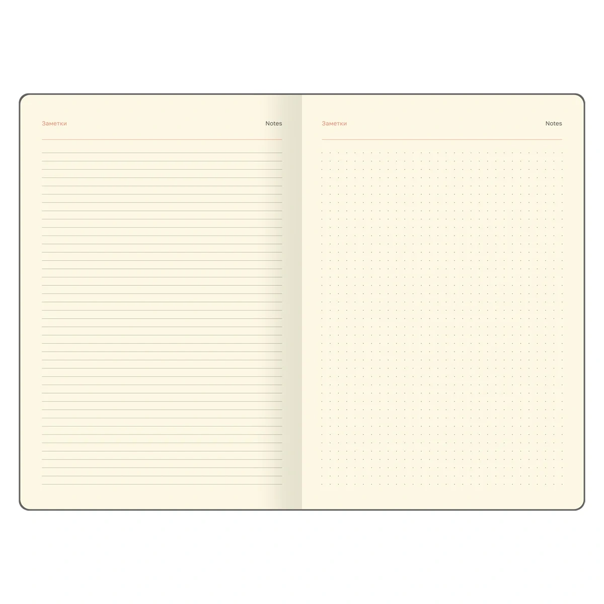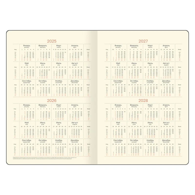 Внутренний блок состоит из 64 листов тонированной бумаги плотностью 70 г/м2 и печатью в 2 краски. Скруглённые уголки. Изделие представлено формате B5 (178*253 мм).